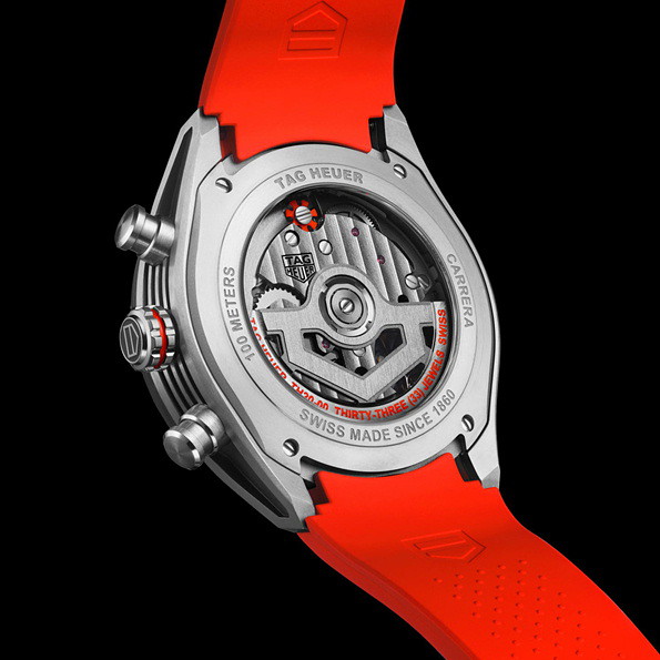ロジウムプレートのスケルトンダイヤルにはグレイン仕上げのブラックのディテールが施され、オープンワークのカウンターには、エクストリームスポーツの鼓動を感じさせるレッドのアクセントがあしらわれています。