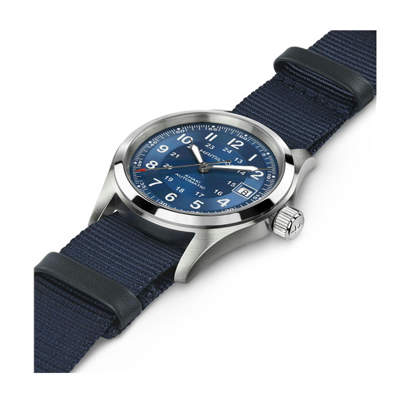 1960年代のオリジナルモデルを忠実に再現した「カーキ フィールド オート」は、標準持続時間80時間を実現するアイコニックなH-10自動巻きムーブメントを搭載しています。ミリタリーのルーツにインスパイアされたこのラギッドなスイス製タイムピースは、ステンレススチール製ケース、ブルーダイヤル、薄暗い中でも視認性を確保するスーパールミノバ®加工の針を備えています。耐久性に優れたブルーNATOストラップがミリタリーな印象を強調し、あらゆるシーンで活躍する準備が整っています。