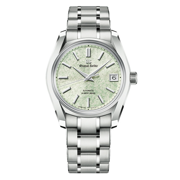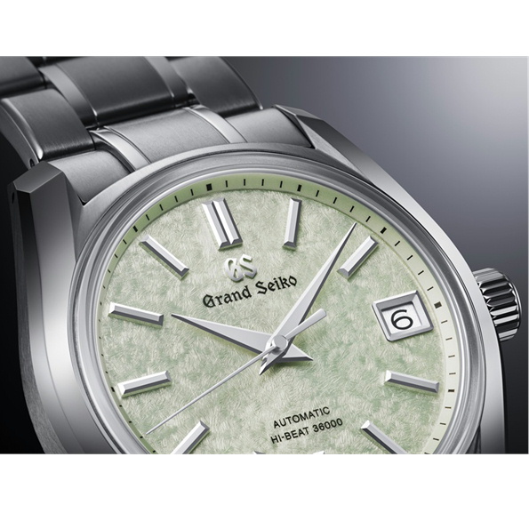 現代に至るまで継承されているブランド哲学「実用性の進化」を体現した傑作モデルとして名高いグランドセイコー初の自動巻メカニカルモデル「62GS」を、現代的解釈によってアレンジしたモデルです。ライトグリーンのダイヤルは、二十四節気の一つである春の「清明」の頃に芽吹く、桜の若葉をイメージ。薄桃色の桜の花びらの合間で陽の光を透かして光る若葉の瑞々しさを表現しました。ムーブメントには毎秒 10 振動のハイビートムーブメント「キャリバー9S85」を搭載し、精度のばらつきを抑え、より安定した高精度を実現。ケース径38mmのサイズ感に加え、ケースとブレスレットには通常のチタンよりも傷つきにくく、白く美しいブライトチタンを採用し、心地よい装着感を創出しました。