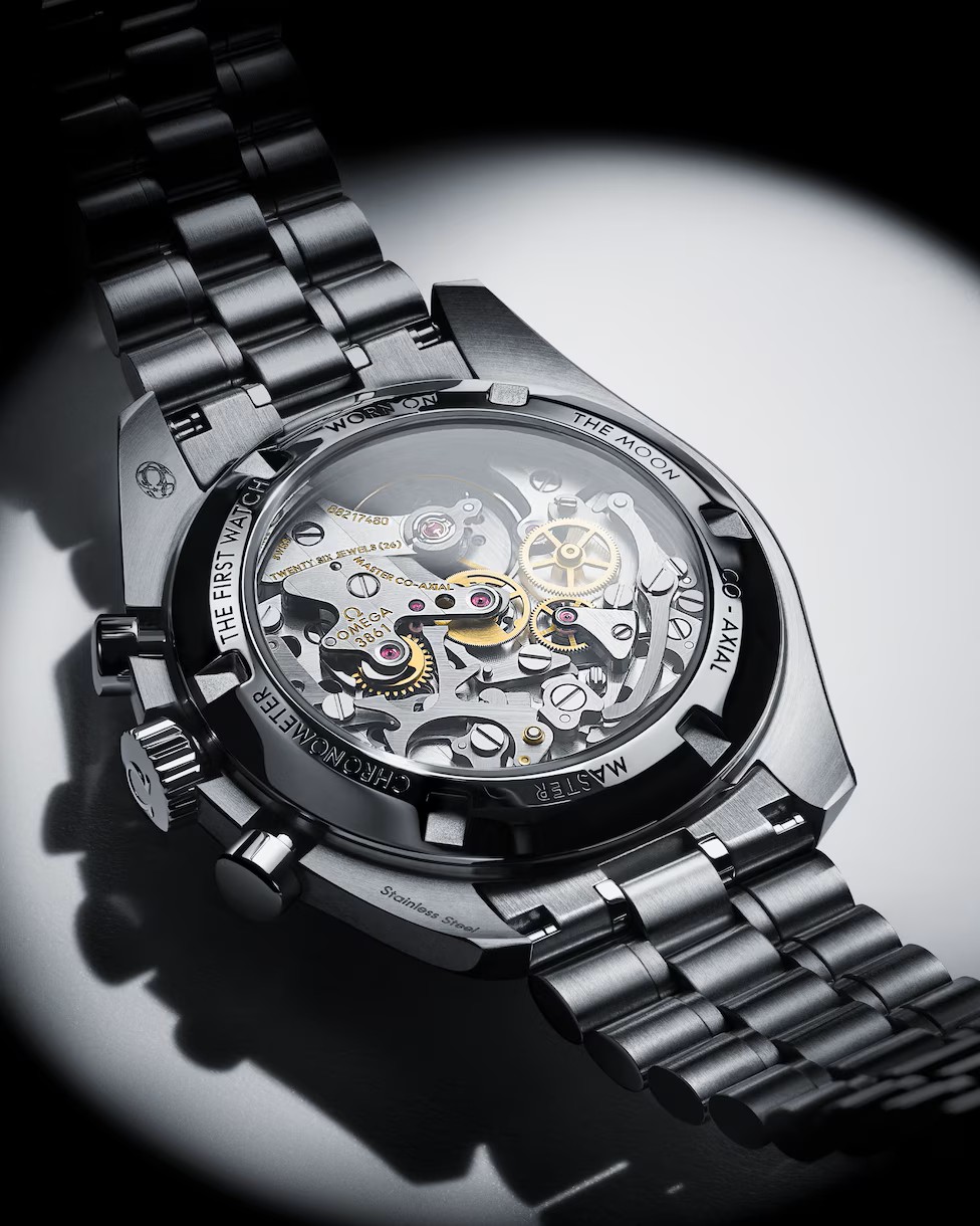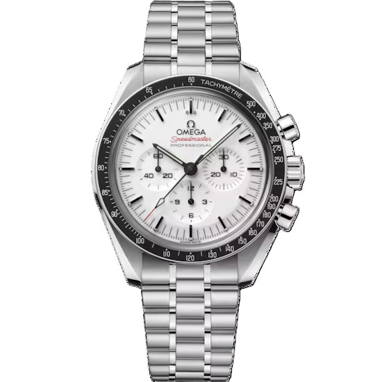 ポリッシュ仕上げとサテン仕上げを施したブレスレットが付属する、この42mmのステンレススティール製ムーンウォッチは、フロントとケースバックにサファイアクリスタルガラスが採用されています。月面で着用された第4世代のスピードマスターのデザインからインスピレーションを得たこのモデルは非対称ケースを備え、ホワイトラッカー仕上げの段差を設けたステップダイアルには、アプライドのオメガロゴとインデックス、ムーンウォッチスタイルの針が配されています。そして、陽極酸化処理を施したアルミニウム製ベゼルリングに有名な「ドットオーバー90」(90の数字の上にドット)があしらわれています。