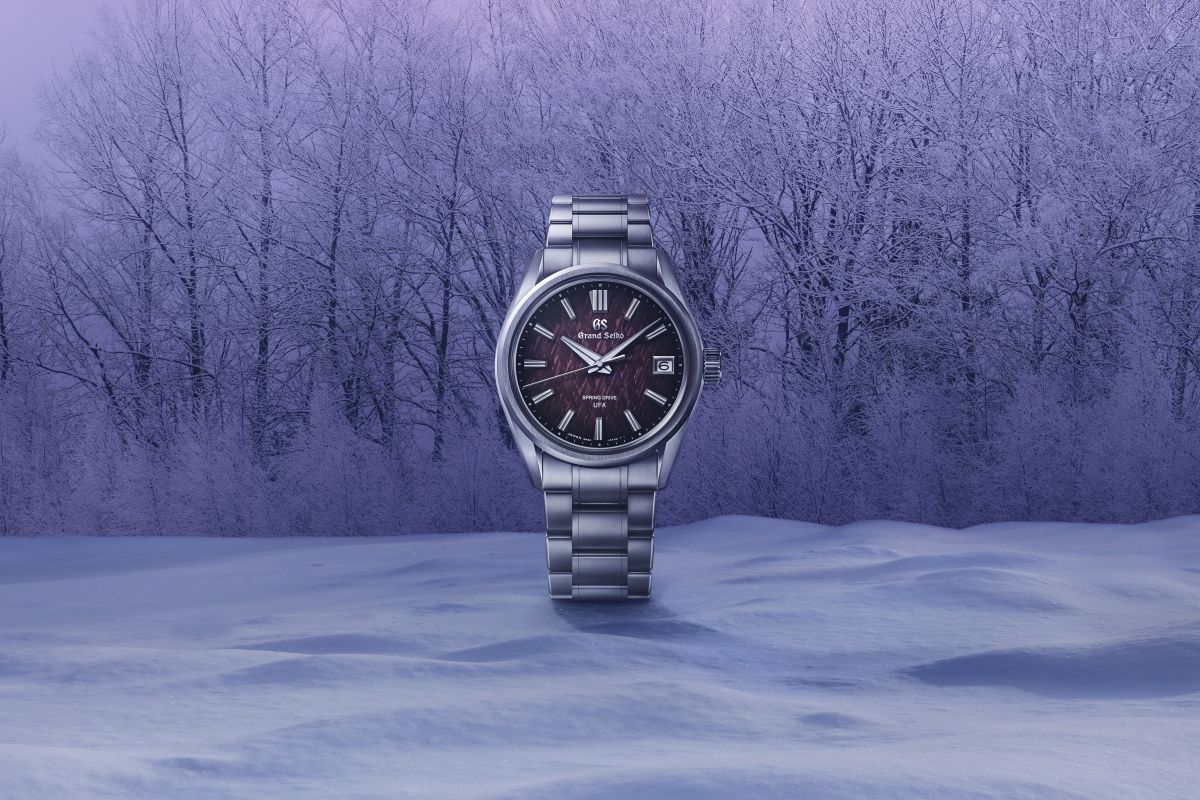 グランドセイコーの真髄と日本の美意識を高い次元で融合させた独自のデザイン文法「エボリューション9スタイル」をベースにした、スプリングドライブU.F.A.の限定モデルです。ダイヤルには、スプリングドライブの製造地である信州地方の樹氷の森が静かに目覚める夜明けの神秘的な情景を、精緻な型打模様とバイオレットカラーの繊細なグラデーションで表現しました。ムーブメントには、ぜんまい駆動式の腕時計としては世界最高の年差±20秒という高精度を実現した「キャリバー9RB2」を搭載しています。
