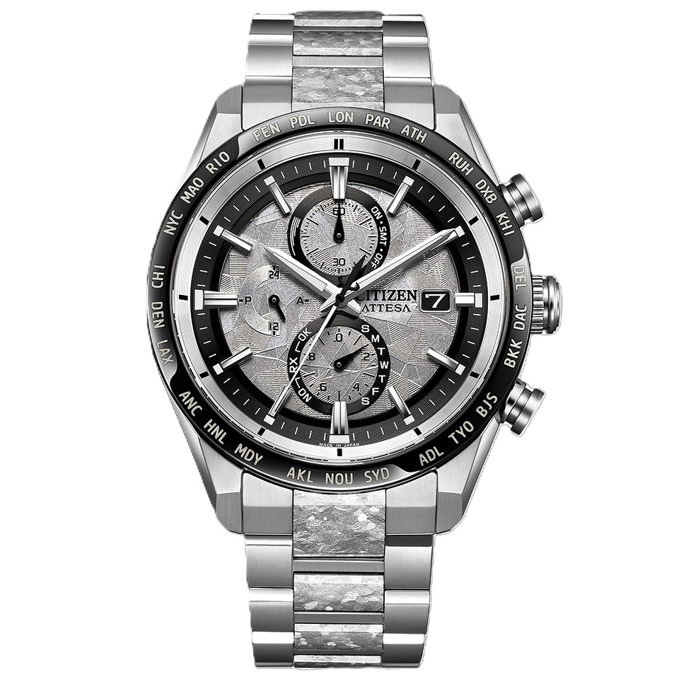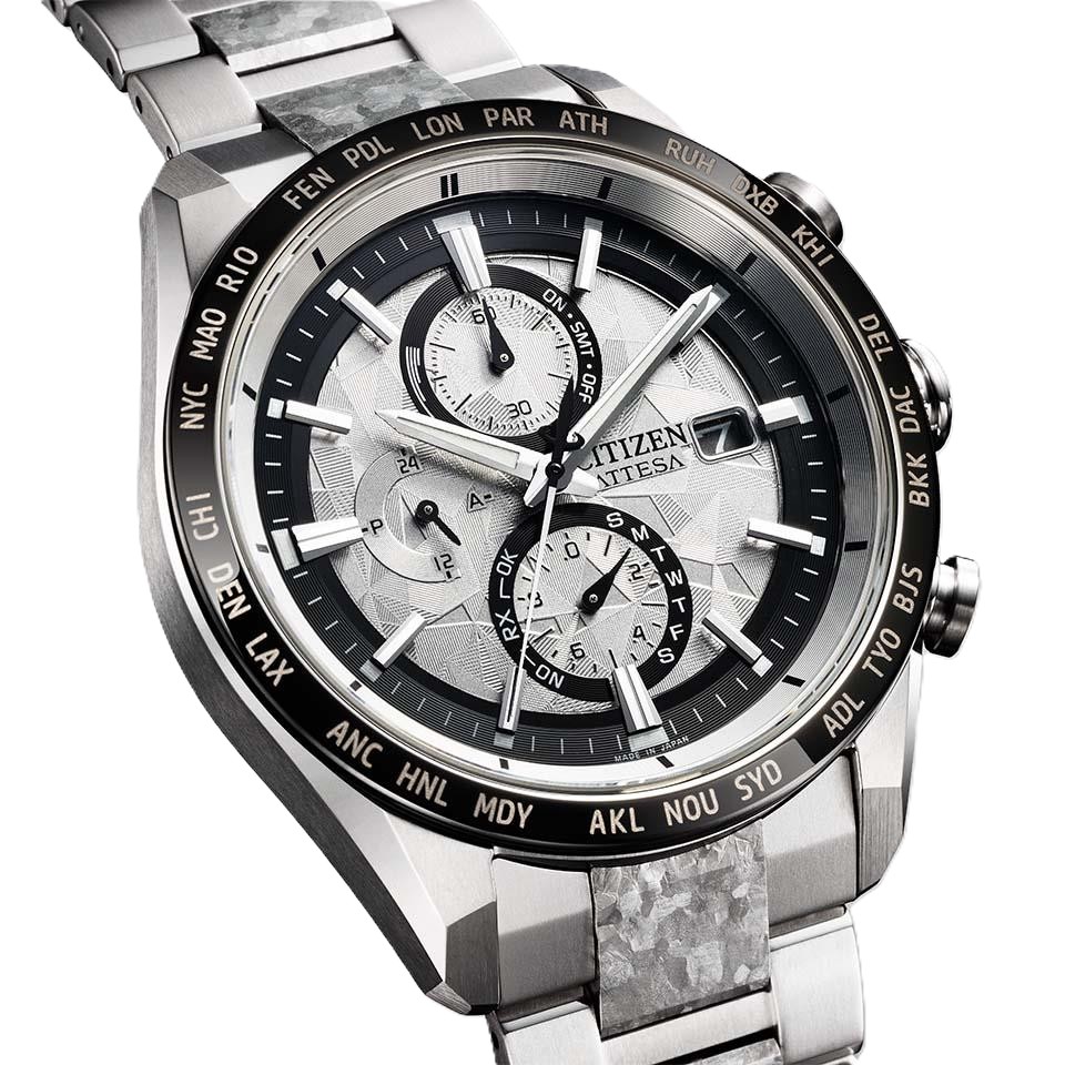 シチズン独自の技術で開発した結晶チタニウムを中駒に採用。デュラテクトプラチナを重ねることで結晶模様がプラチナの輝きをまとい、存在感を放ちます。