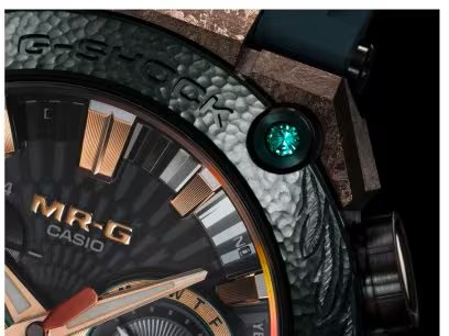 ベゼルには鳳凰の頭と尾が彫られており、今にも羽ばたきそうな躍動感と立体感を感じます。ベゼル四隅にはエメラルドが4石埋め込まれており、高級感を引き立てています。文字盤は、矢羽根をイメージしており、外周に向かって放射状に広がっています。ケースは日本刀の刃文に見られる「沸(にえ)」をイメージしており、粗い粒子状で独特の模様です。