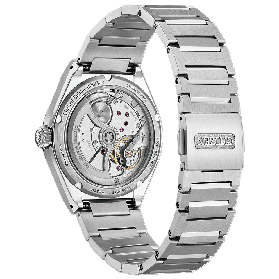 アイボリーカラーの文字板に、The CITIZENのシンボルである「イーグル」の羽を模したパターンを電鋳で施し、落ち着いた色味の中に躍動感のある仕上げが印象的なモデルです。裏ぶたはシースルーバック仕様で、リミテッドエディションナンバーが刻印されています。