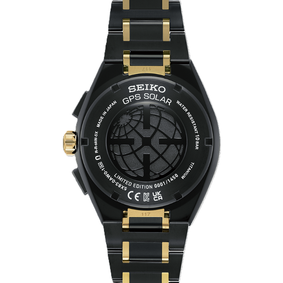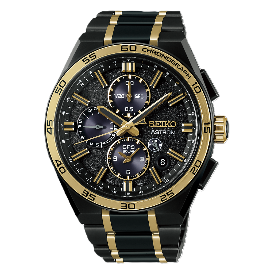 透明感のあるサファイアガラスベゼルの表示板にもゴールドカラーがあしらわれ、奥行きと立体感を演出しています。また、ダイヤルリングに記された、タイムゾーン表示の1、4、5は、セイコー創業145周年にちなみ、ゴールドであしらいました。