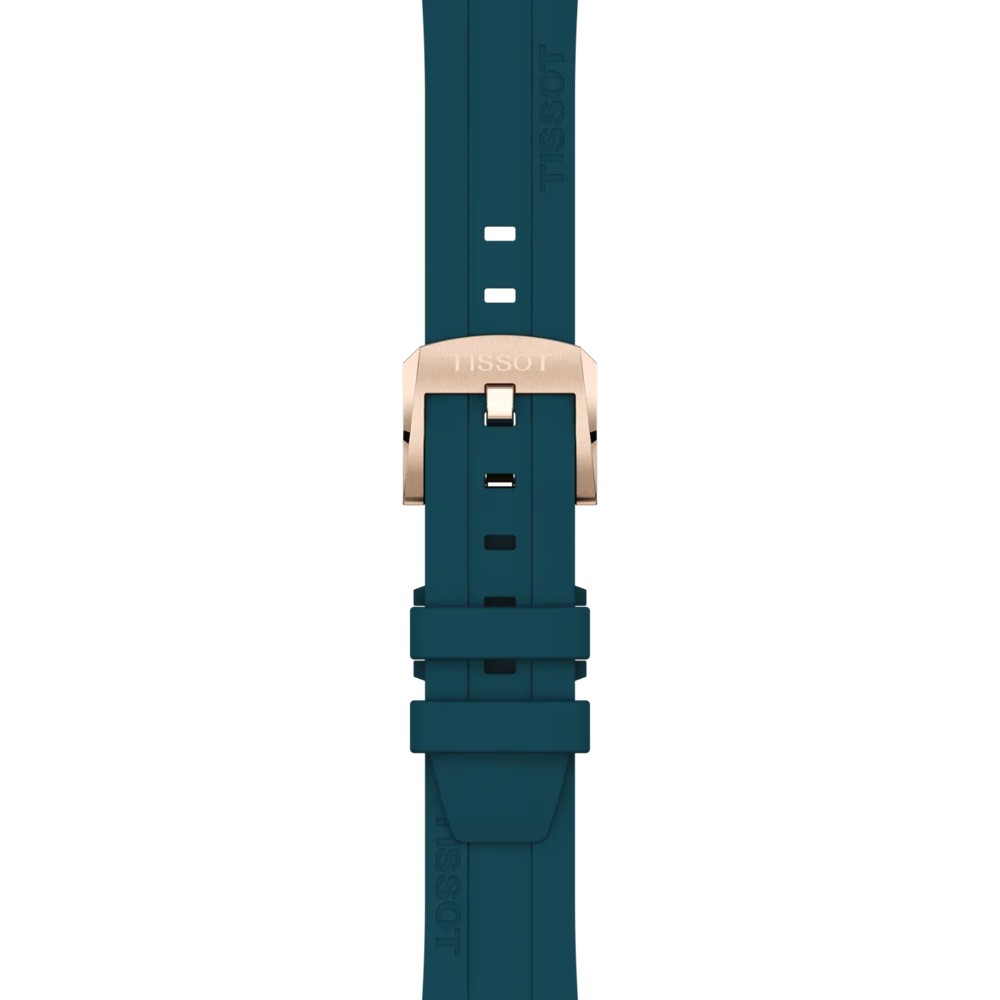 ケースには、PVDコーティングによる「カーネーションゴールド」を採用。ギラギラとした金色というよりも肌なじみの良い落ち着いた印象を受けます。ストラップも爽やかなターコイズブルーで腕元のアクセントになってくれます。