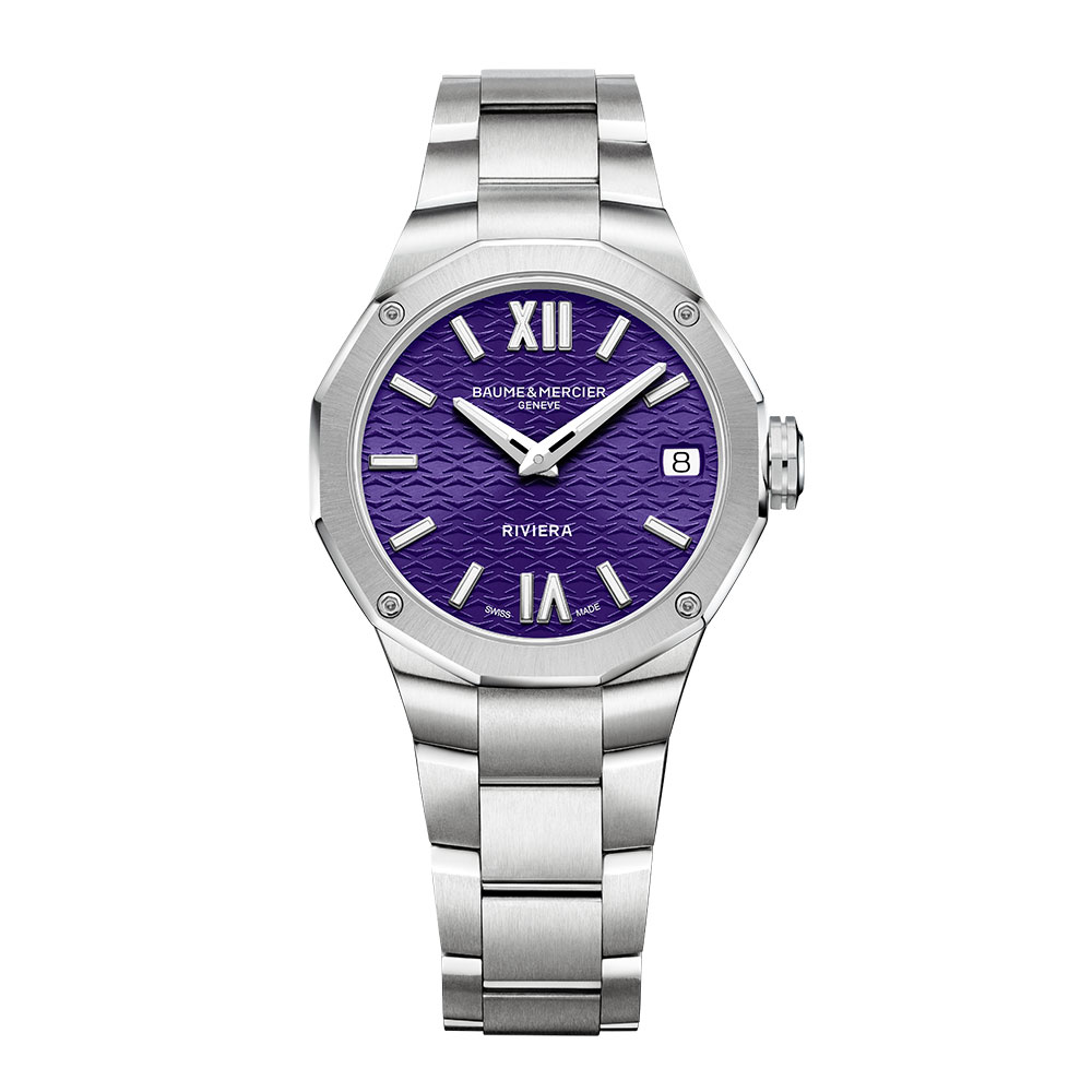 ほのかに明るいパープル文字盤に、細やかで透明なウェーブ装飾を施しているのもポイント!