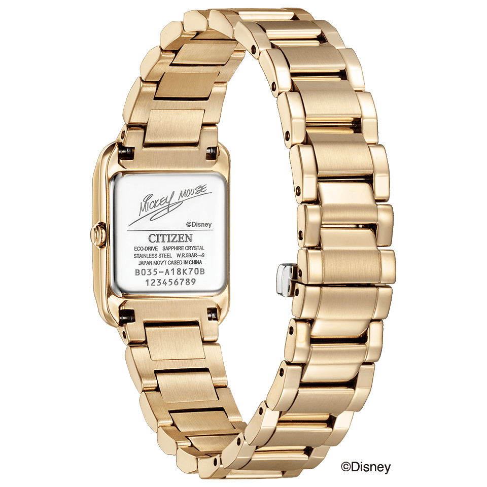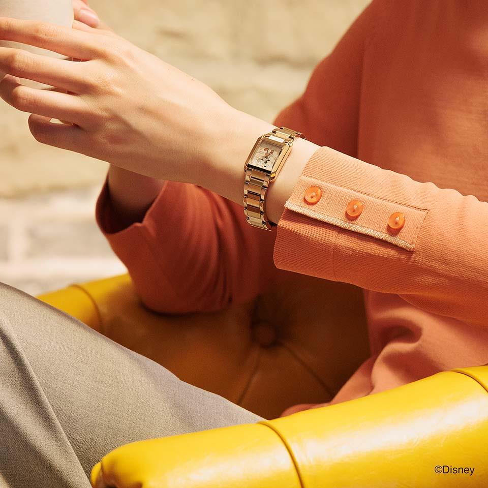 文字板の中央に「ミッキーマウス」を描いた限定モデル。ウォームゴールドのケースとバンドに、ピンクベージュの文字板を組み合わせ、クラシカルな雰囲気を演出。インデックスはアラビア数字、針には白樹脂をプラスし、視認性にも考慮したデザインに仕上げています。裏ぶたに「ミッキーマウス」のサインを刻印した限定仕様です。