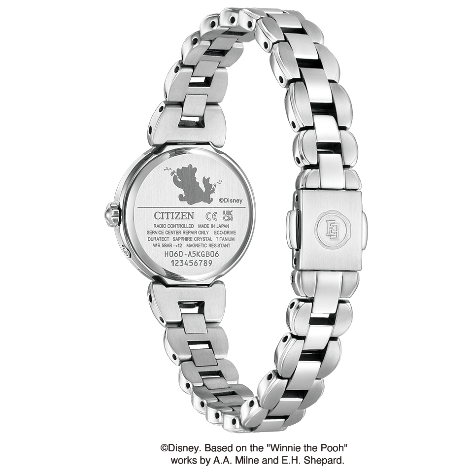 『くまのプーさん』の世界観を表現した限定モデル。白蝶貝文字板に、タンポポの綿毛が舞う森でうたた寝をしている「プーさん」を描き、インデックスには『くまのプーさん』の世界観に合わせた可愛らしいデザインのアラビア数字を採用しました。裏ぶたに綿毛を吹く「プーさん」と「ピグレット」のシルエットを刻印した限定仕様です。