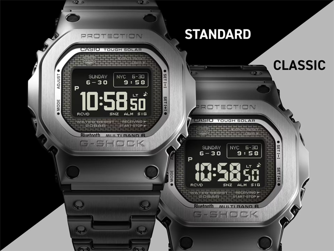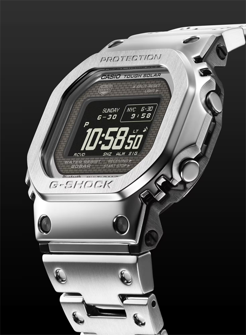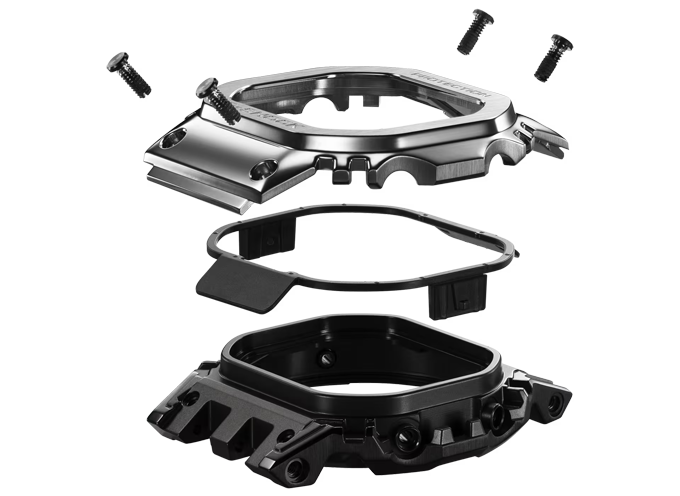 ベゼルとセンターケースを上下で連結した構造を開発。ケースサイドから見える造形が構造の美しさを強調。フルメタルながらG-SHOCKの耐衝撃基準をクリアし、気密性に優れたスクリューバックケースも採用しています。