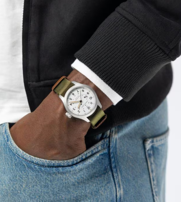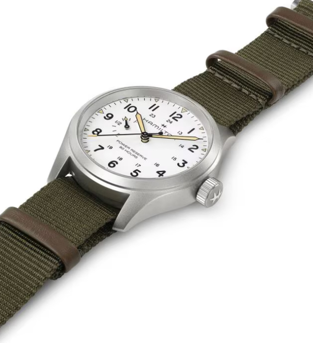 ラギッドなカーキグリーンのNATOストラップを備えたホワイトのダイヤルには、