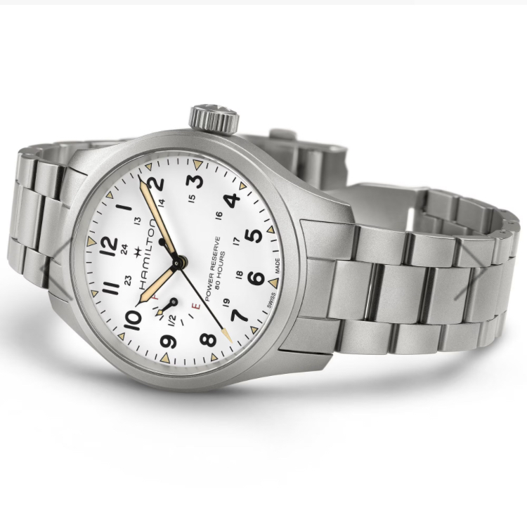 ETA社がハミルトンのためだけに開発した、新しいH-23手巻きムーブメントを搭載し、初めて標準持続時間80時間をダイヤル上で直接確認することができるようになりました。