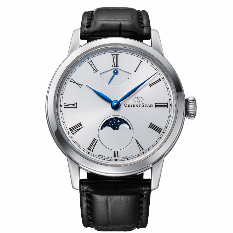 ホワイト文字板のレギュラーモデルが描き出すのは「夜の静寂に月がひとつ」ある情景。きめ細かな放射目仕上げに厚クリア塗装(ラッピング加工)を加えた文字板は、艶やかで優美な質感にブルーのリーフ針が映え、上質なクラシシズムを演出。