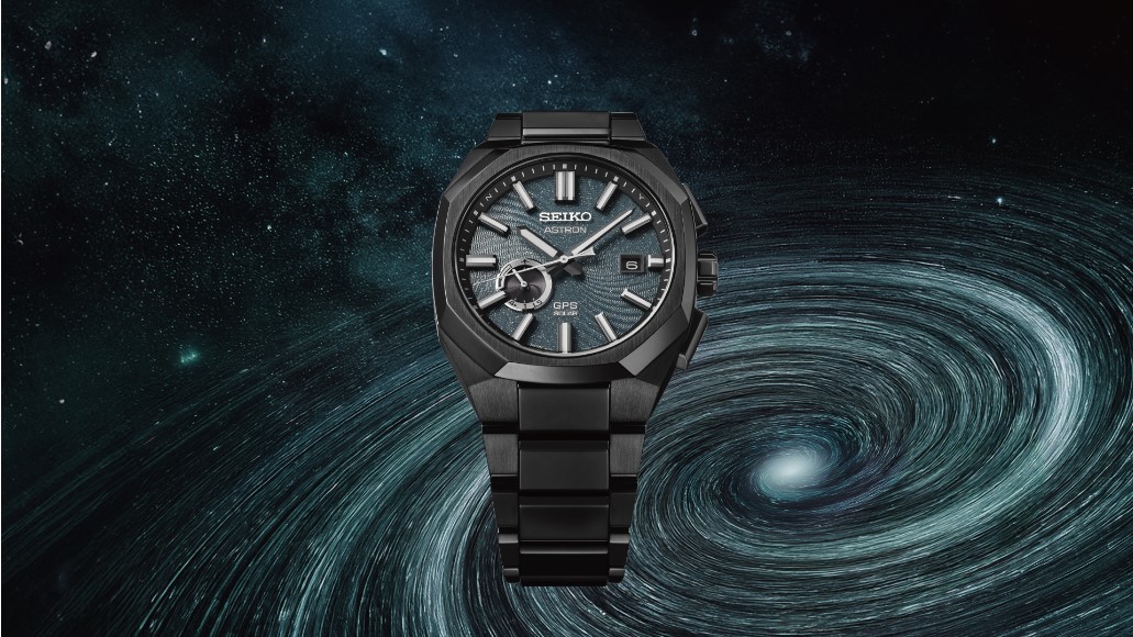 また、漆黒な宇宙の中で、渦巻く銀河が浮かび上がる様を、オールブラックカラーのケース・ブレスレットと、ダークターコイズカラーをベースとしたラメ入りダイヤルが表現しています。