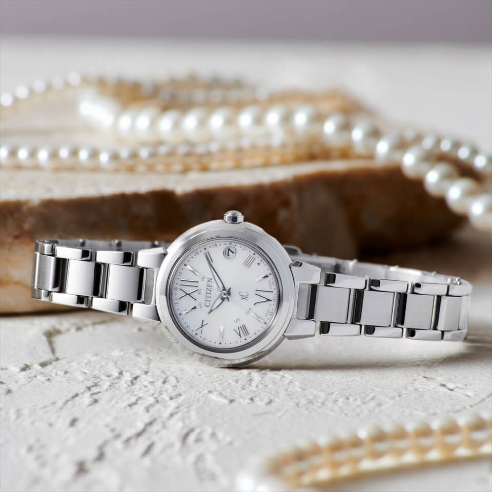 エターナルプラチナと爽やかなホワイト文字板の組み合わせがクリアで爽やかな凛とした印象のモデル。