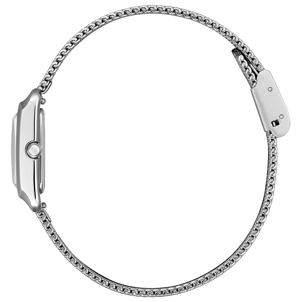 文字板は「光の揺らぎ」をテーマにデザイン。ストライプのパターンとラメの煌めきが、深みのある美しさを演出しているシリーズ。大胆なカットを施したカーブサファイアガラスと、やや丸みをおびたケースラインが、女性のしなやかさと芯の強さを感じさせます。メッシュバンドに加え、サステナブルな素材「ECOPET®」を使用した替えバンド付き。レバー付きばね棒仕様なので、その日の気分やファッションに合わせてご自身で手軽にバンドの付け替えができます。