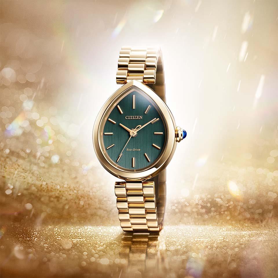 「Rain(雨)」と「Bella(美しい)」を組み合わせて名付けられた“RAINELL”(レイネル)。地球を潤し、世界を映しながら光を反射する雨の雫にインスピレーションを得たジュエリーライクなコレクションです。優雅な曲線を持つドロップ形状を印象付けるかのように、腕の動きでリズミカルな輝きを演出するボリュームある3列バンドを採用。彫刻的なフォルムは、立体感と陰影が美しく際立ち、どの角度から見ても洗練された存在感を放ちます。文字板には、霧雨を思わせるヘアラインパターンを施し、クラシカルで落ち着いたバランスのインデックスを配置、上品な印象に仕上げました。