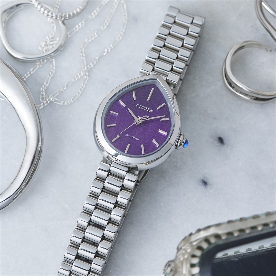 「Rain(雨)」と「Bella(美しい)」を組み合わせて名付けられた“RAINELL”(レイネル)。地球を潤し、世界を映しながら光を反射する雨の雫にインスピレーションを得たジュエリーライクなコレクションです。優雅な曲線を持つドロップ形状を印象付けるかのように、腕の動きでリズミカルな輝きを演出するボリュームある3列バンドを採用。彫刻的なフォルムは、立体感と陰影が美しく際立ち、どの角度から見ても洗練された存在感を放ちます。文字板には、霧雨を思わせるヘアラインパターンを施し、クラシカルで落ち着いたバランスのインデックスを配置、上品な印象に仕上げました。