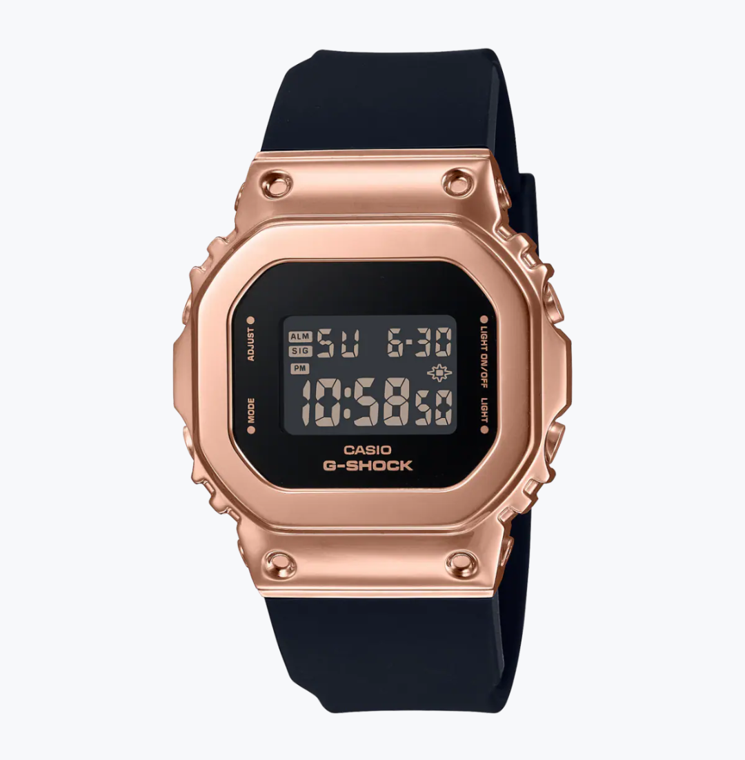 初代モデルから採用されているスクエアデザインのGM-5600を小型化し軽量で快適な着け心地を実現。ベゼルカバーにはピンクゴールドIPのメタルを使用、バンドにはブラックをあしらったエレガントなG-SHOCKです。