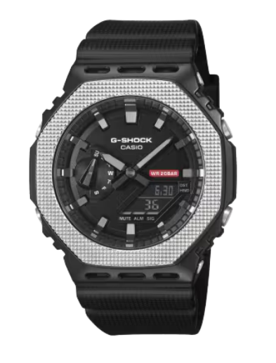G-SHOCKの耐衝撃性を象徴するメタルの八角ベゼルには、モダンインダストリアルデザインでも多く見られるチェッカリングパターンを施し、メタルベゼルや機能表示をマーキングした赤いアクセントカラーが機能性を豊かに表現しています。