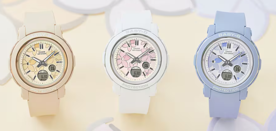 アクティブな女性に向けた耐衝撃・カジュアルウオッチBABY-Gから、フェイスに花柄をあしらったアナログウオッチです。
