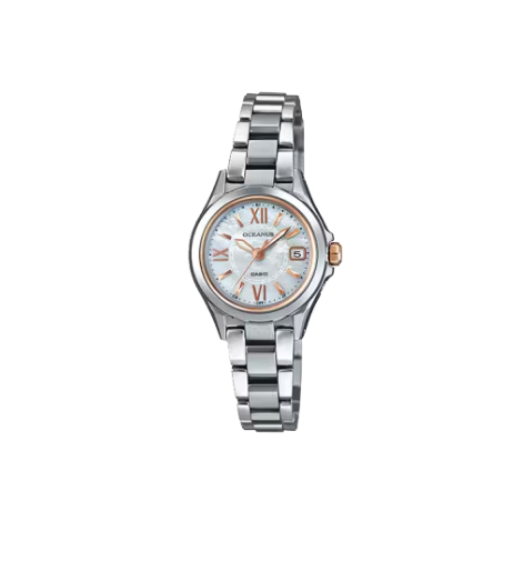 OCEANUSの小型レディスモデル、シンプルで利便性の高いデイト付3針モデルでケース直径30.3mm、厚さは8.6mm、重さ31gと女性が使いやすい小型・軽量サイズに仕上げました。秒針位置自動補正機能により万が一の針ずれにも対応し毎日安心して使用することができます。文字板には白蝶貝を採用し、風防ガラスの外周部、インデックス、針にピンクゴールドを配しました。風防には反射防止コーティングを施したデュアルカーブサファイアガラスを採用し美しさと見やすさを両立した大人の女性に向けた上質さと実用性を併せ持つOCEANUSです。