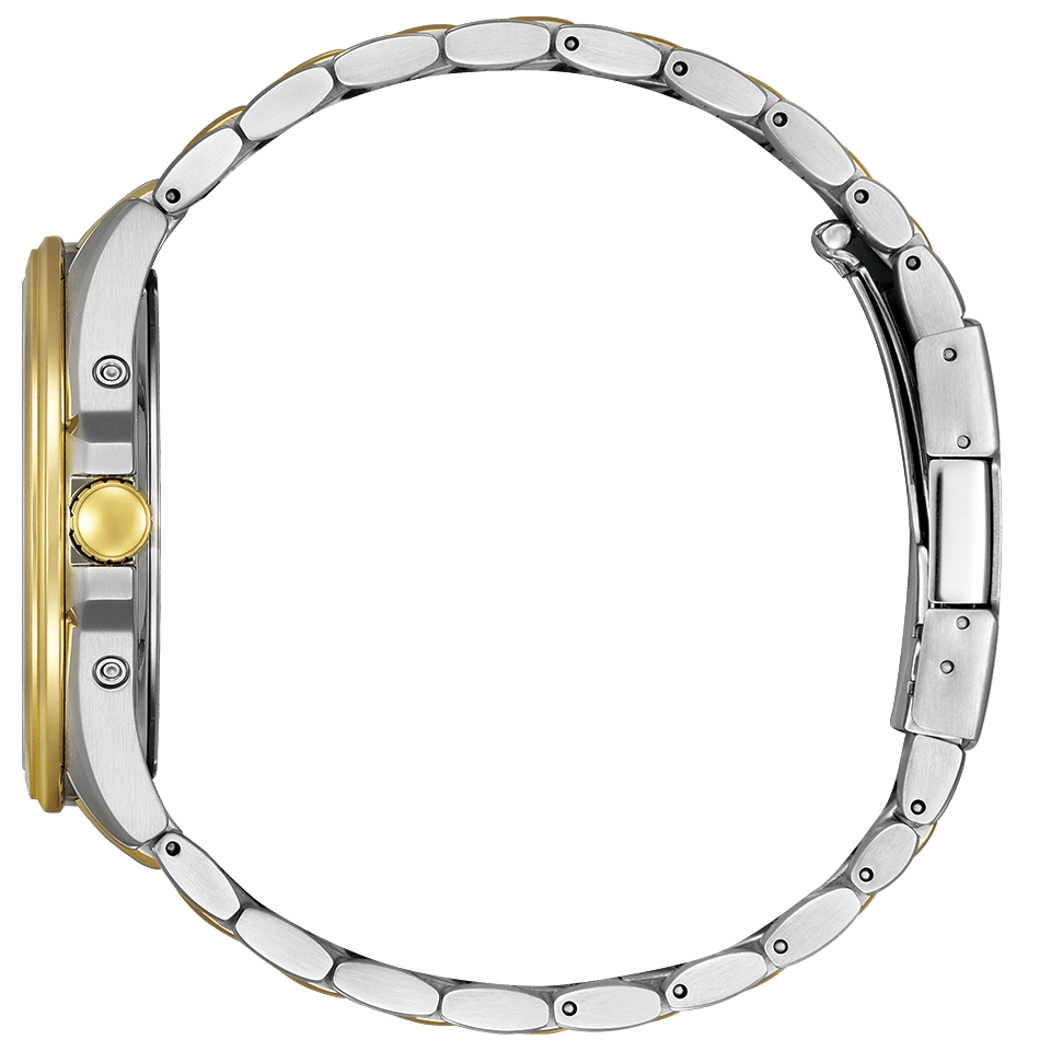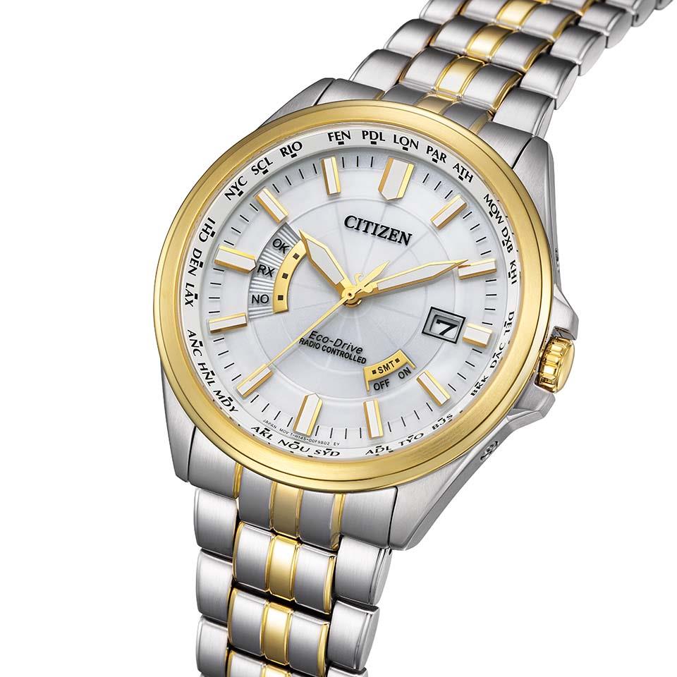 やや大きめの43mmケースに、視認性を確保した夜光付きの太めの針とインデックスを採用したエコ・ドライブ電波時計。バンドの中駒には、ミラー仕上げのゴールドラインをアクセントとしてプラス。文字板、針、りゅうずにもゴールドのパーツを使用した、腕元に華やかさを添える1本です。