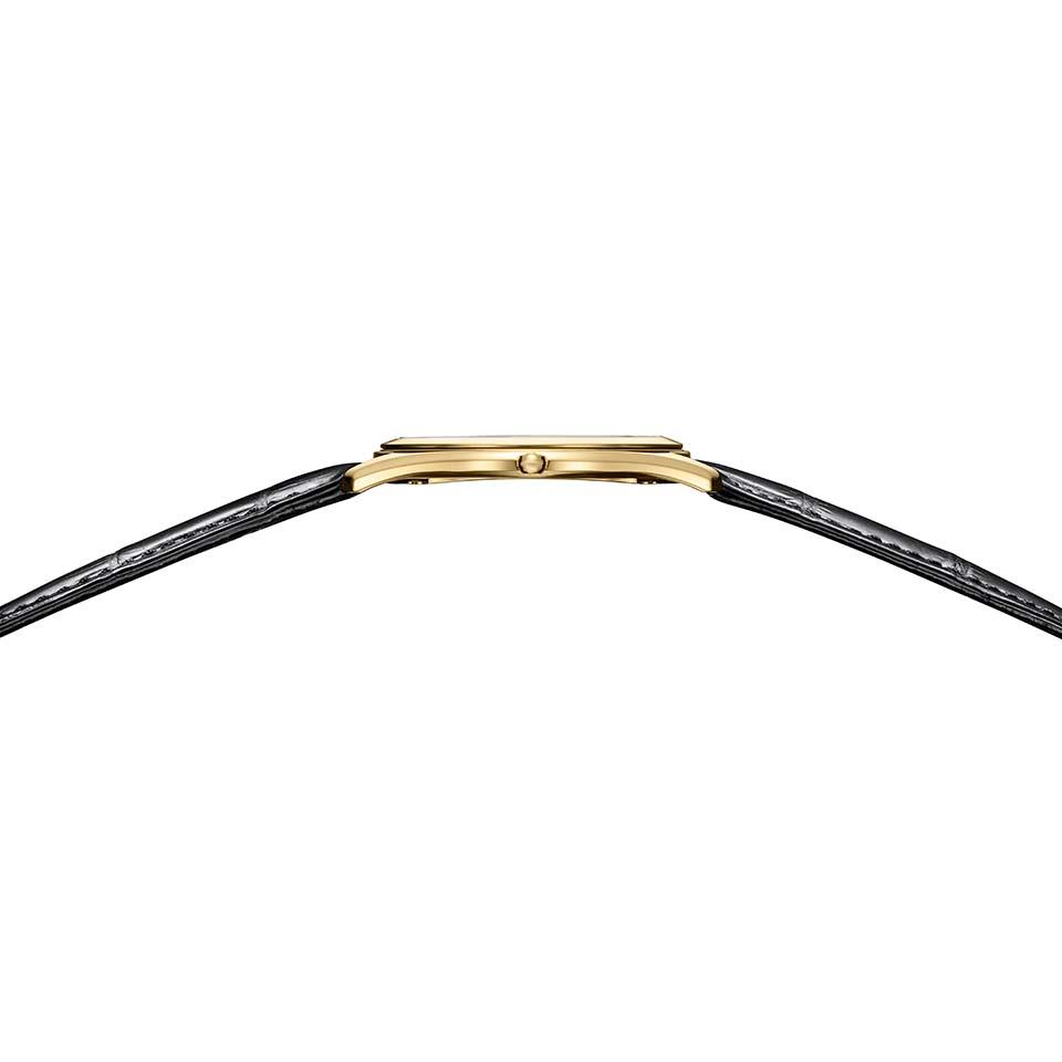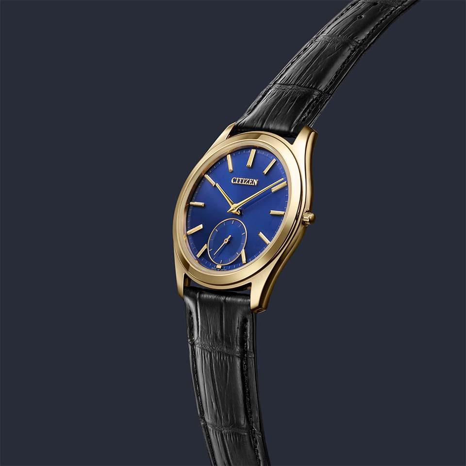 無駄を省いた薄型フォルムに調和するデザインを追求。6時位置のスモールセコンドはインデックスを短くし、ミニマルな印象に仕上げています。落ち着いたイエローゴールド色「アンバーイエロー」のケースに知性を感じさせる深いブルーの文字板を合わせたクラシカルな雰囲気が大人の落ち着きある時間を彩ります。