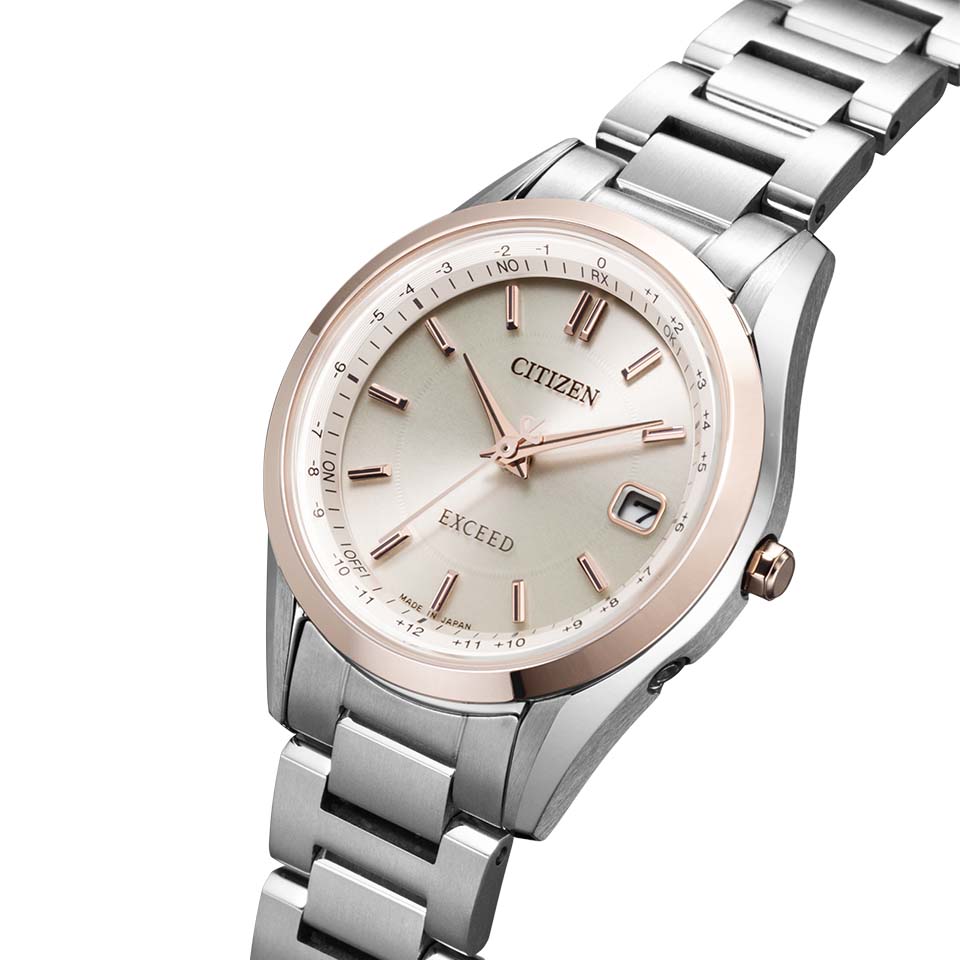 トレンドカラーを取り入れた、シンプルでありながらもメリハリのあるデザイン。ベージュ色の文字板がクラシカルで落ち着きのある印象を与えます。透明感のあるライトシルバー色のケースとバンド、サクラ色のベゼルを配したツートーンデザインが、ひときわエレガントな雰囲気を演出します。