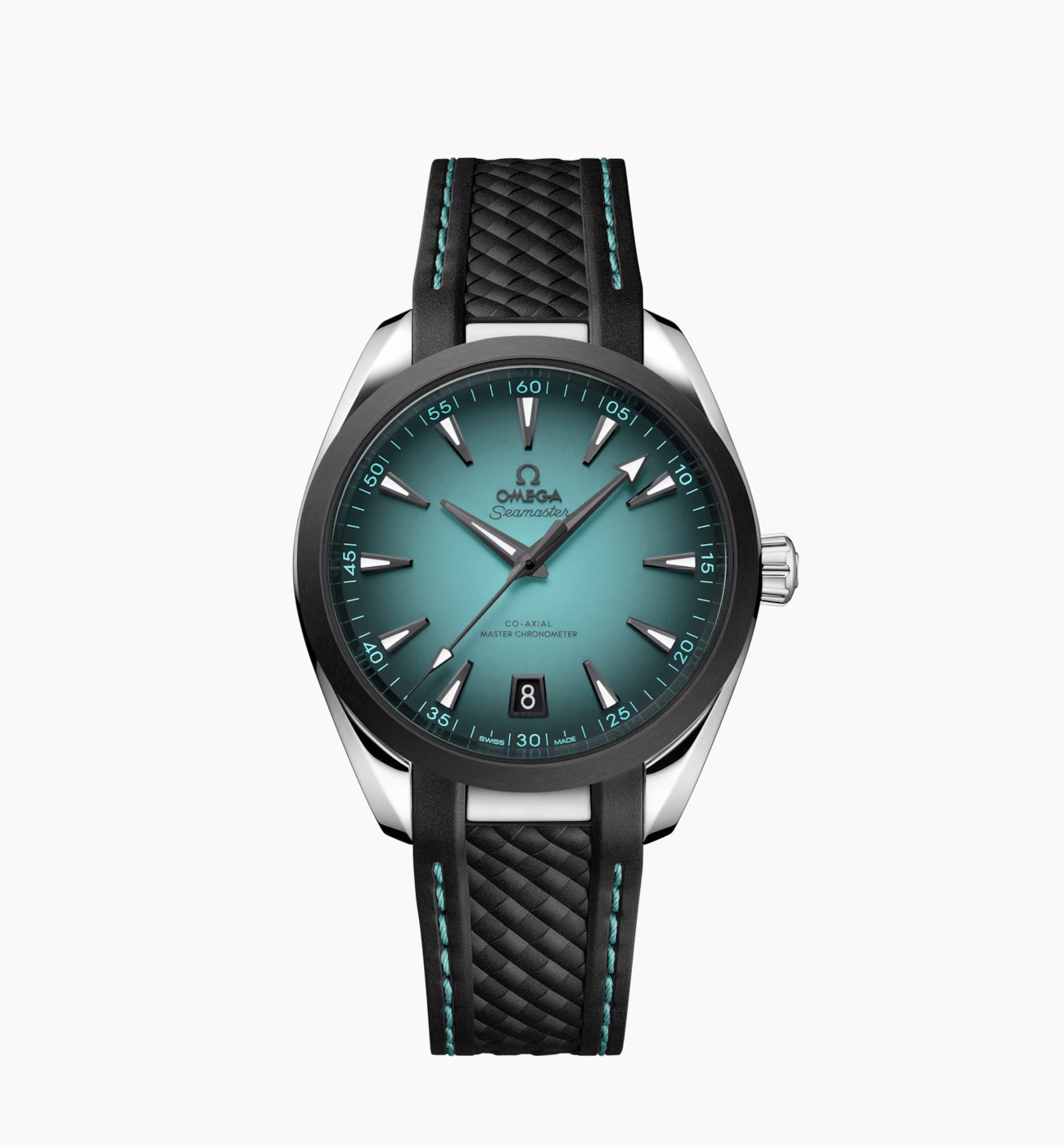 ターコイズのステッチがあしらわれたフォールディングクラスプ付き一体型ブラックラバーストラップが合わせられ、着け心地のよさを約束します。スイス連邦計量・認定局(METAS)認定の業界最高水準を誇るオメガ コーアクシャルマスター クロノメーター キャリバー8900搭載。