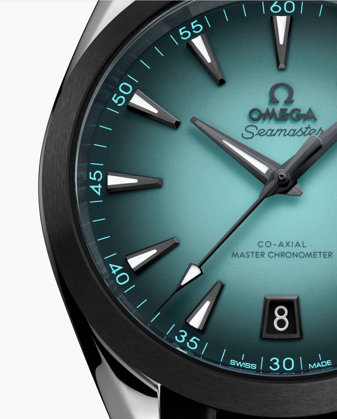 海をインスピレーションにした魅惑的な色彩を奏でるラッカー仕上げのターコイズダイアルには、ブラックのグラデーションが施され、面取りされた針とインデックスはグレーのPVD加工とホワイトのスーパールミノヴァで仕上げられています。同じくグレーのPVD加工が施されたオメガのロゴと日付窓がグレーの転写文字とマッチし、外周のターコイズカラーのミニッツトラックとハーモニーを奏でています。