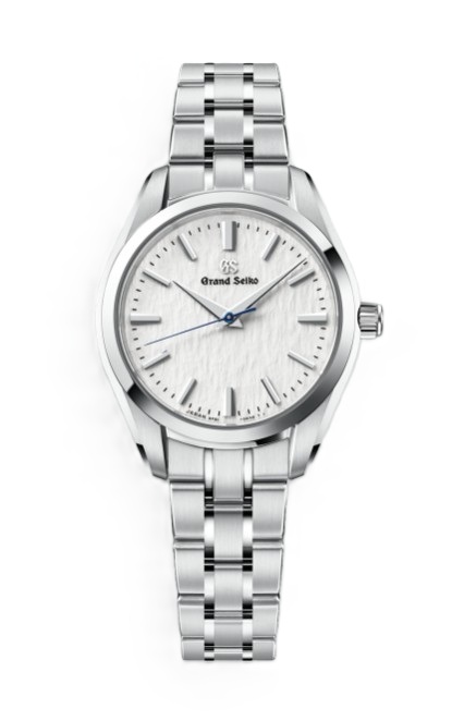 グランドセイコーのクオーツモデルの製造地であるセイコーエプソン塩尻事業所内「信州 時の匠工房」から望むことができる穂高連峰では、冬の時期になると未踏の雪原に風が刻む風雪紋を目にすることがあります。その耽美な風雪紋を表現する「雪白パターン」をあしらい、真っ白な冬景色をダイヤルに写し取った、ケース径33mmの小ぶりなモデルが登場。まっさらな雪と風が生み出す偶然の美しさと儚さが、匠の技によって繊細に作りこまれています。