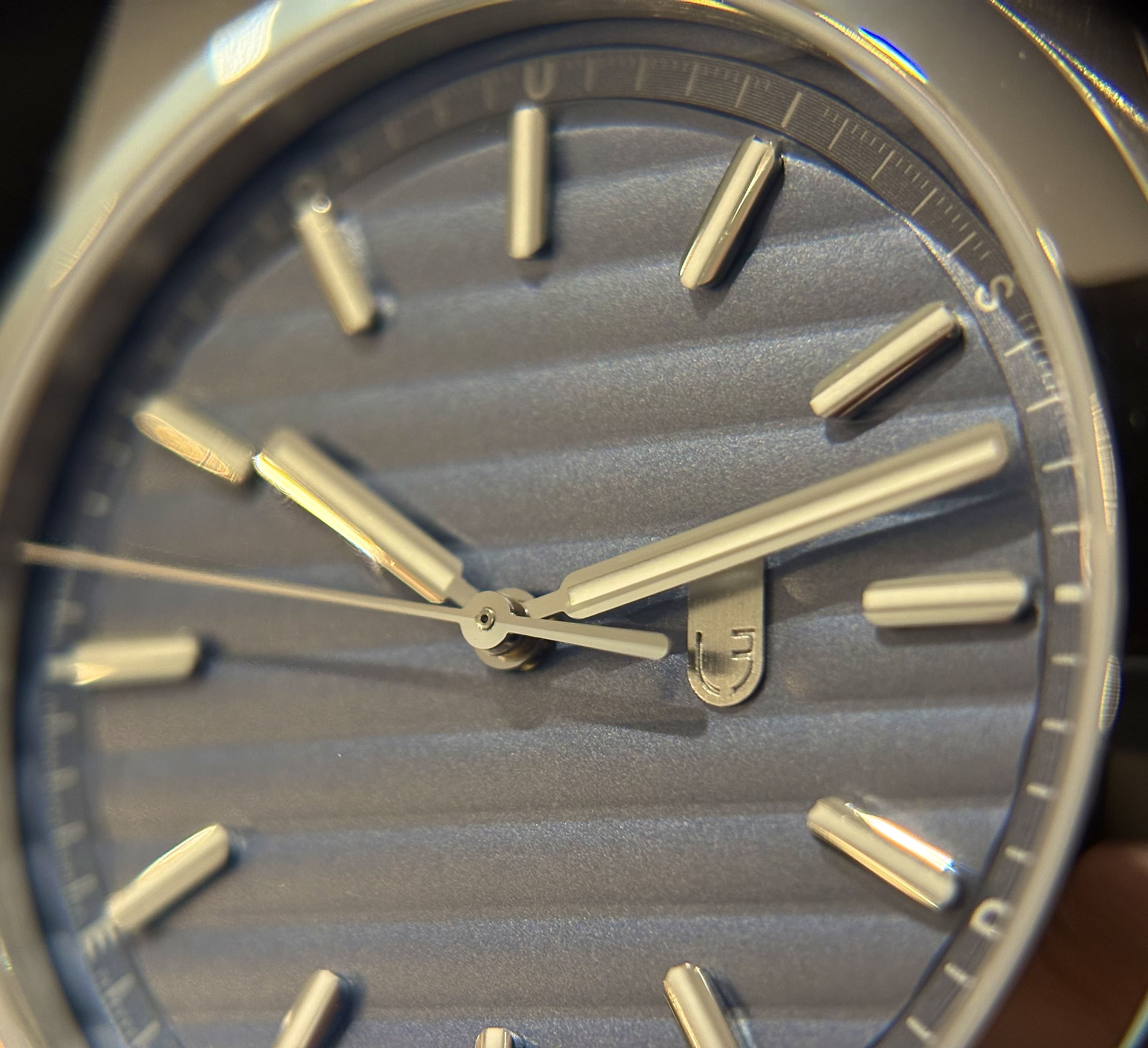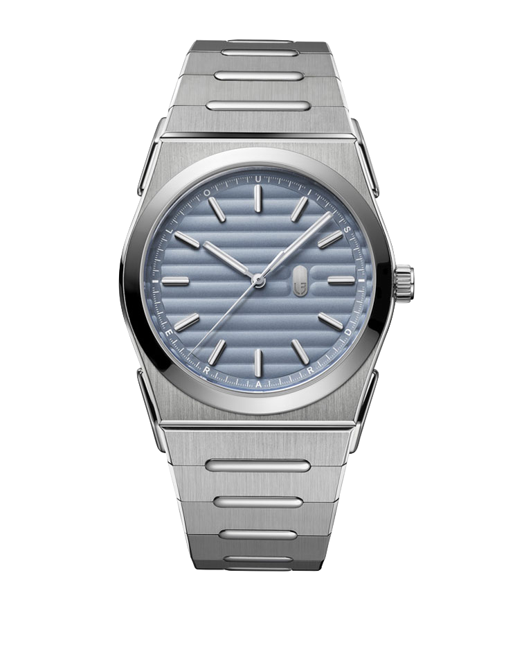 文字盤 ブレスレットのセンターリンクをイメージしたライン模様(SLATE文字盤)/3時位置にカプセル形状のロゴマーク/インデックス外側にブランドロゴを配置