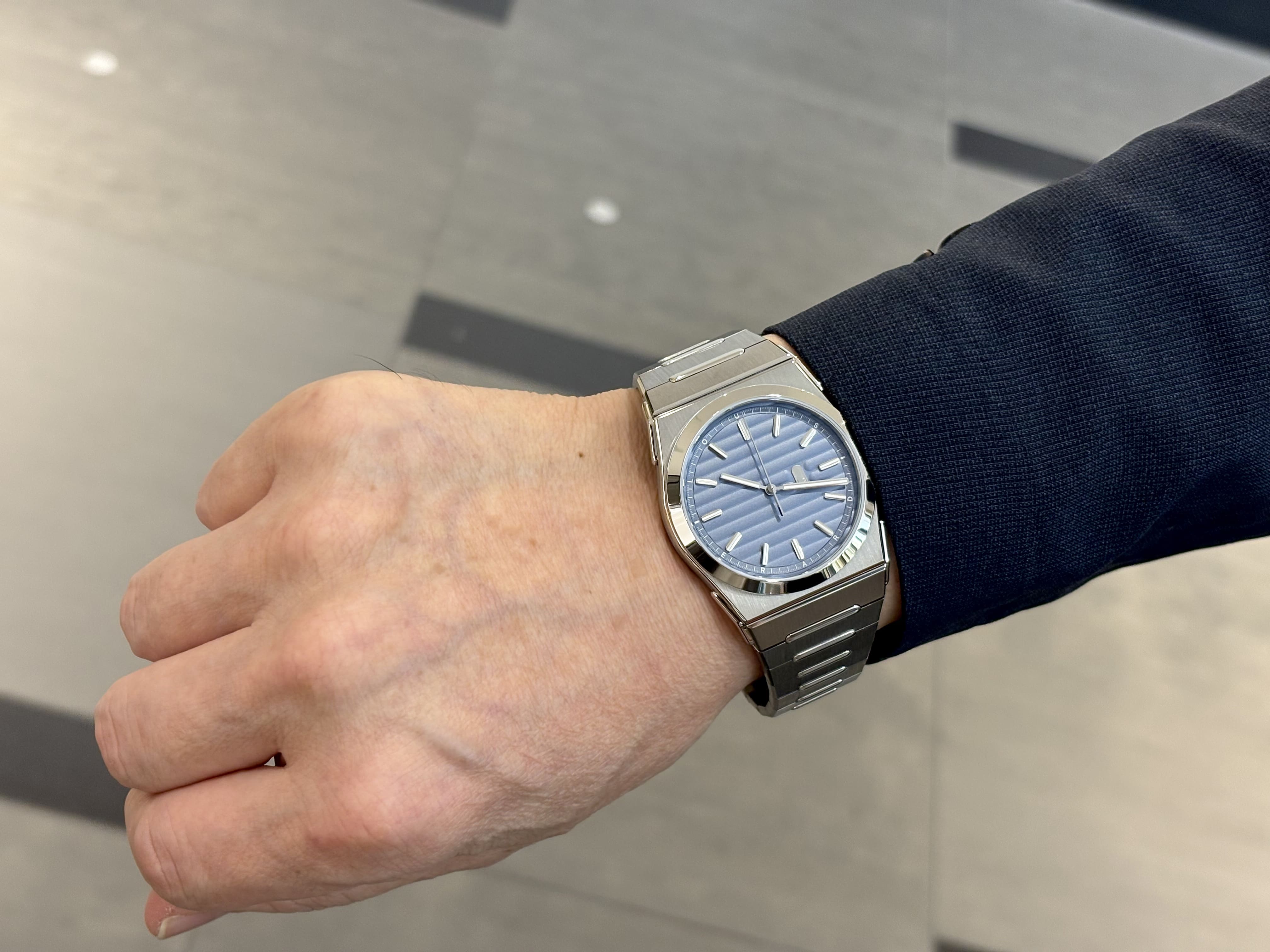 ケース サテン仕上げのチタン(ミドルケース)、ポリッシュ仕上げのステンレススチール(ラグ、ベゼル、ケースバック)