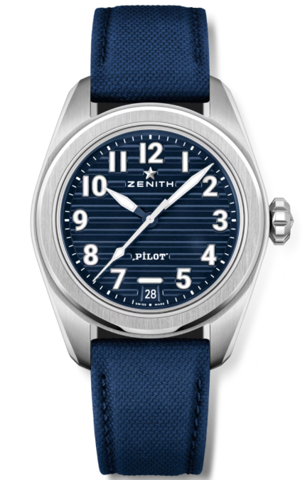 パイロット オートマティック ブティック エディション ウォッチは、スチール製40mmケース、大型リューズ、波型のブルー文字盤、スーパールミノバを塗布した大型のアラビア数字を備えています。交換可能なブルーのコーデュラ・エフェクト ラバーストラップとブラウンのカーフスキン レザーストラップが付属しています。高振動エル・プリメロ 3620自社製自動巻ムーブメントを搭載。