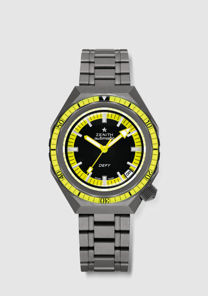 1969年に発売された初のデファイ ダイバーズウォッチからインスピレーションを得た「デファイ リバイバル」。ファセットカットを施した37mmのケースにはマイクロブラスト仕上げチタンを採用しています。逆回転防止ベゼルに、イエローに着色されたサファイアインサート。60気圧の防水機能。ブラックとイエローの文字盤には、夜光塗料を塗布した針とマーカーが配されています。約50時間のパワーリザーブを備えるエリート 670 自動巻自社製ムーブメントを搭載。マイクロブラスト仕上げチタンブレスレット、フォールディングバックル付き。