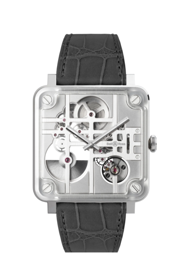 BR‑X3 Micro‑Rotor は、Bell & Ross を象徴するスクエアケースと4本のシグネチャースクリューを受け継いでいます。このモデルのスクエアは、単なる視覚的アイコンを超え、構造そのものとなっています。ケースとキャリバーが一体化し、ムーブメントのブリッジはキャリッジによって直接支えられています。このラディカルな構造は、キャリッジとムーブメントを一体化したスチール製の中央プレート、上面のサファイアクリスタル、下面のサファイアクリスタルという3つの要素で成り立っています。