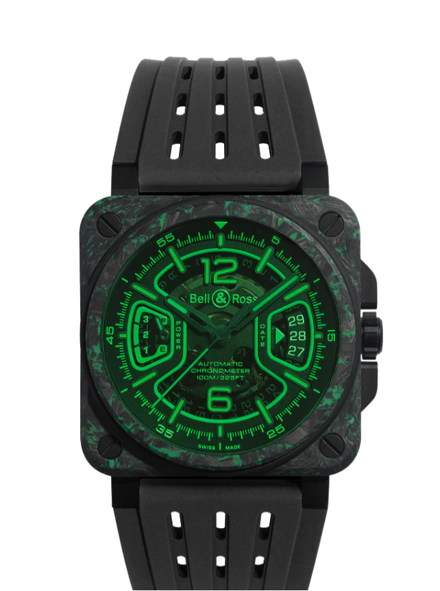 BR-X3 Night Visionのケースは、LUM-CAMO — カーボンファイバーと蓄光樹脂を融合させた最先端複合素材 — とブラックDLCチタン、蛍光グリーンラバーのシリンダーを組み合わせており、卓越した耐久性と暗闇でも完璧な視認性を実現しています。スケルトンダイヤルはグリーンのXマークで強調され、スモークサファイアクリスタルで保護されており、自動巻きムーブメントを露わにします。また、航空用ヘッドアップディスプレイに着想を得て、昼夜問わず瞬時に時刻を読み取ることが可能です。