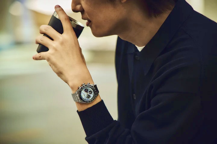 直線状に並ぶセンタークロノグラフ秒針と6時位置の分積算針のカラーリングは白で統一し、クロノグラフ機能の判読性を高めています。