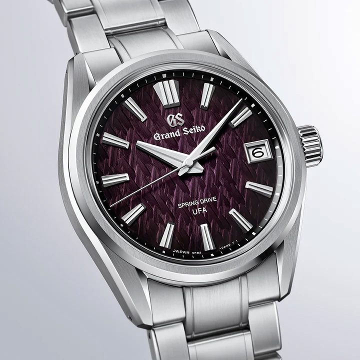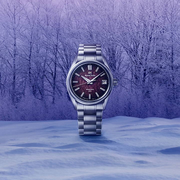 グランドセイコーの真髄と日本の美意識を高い次元で融合させた独自のデザイン文法「エボリューション9スタイル」をベースにした、スプリングドライブU.F.A.の限定モデルです。ダイヤルには、スプリングドライブの製造地である信州地方の樹氷の森が静かに目覚める夜明けの神秘的な情景を、精緻な型打模様とバイオレットカラーの繊細なグラデーションで表現しました。ムーブメントには、ぜんまい駆動式の腕時計としては世界最高(※)の年差±20秒という高精度を実現した「キャリバー9RB2」を搭載しています。