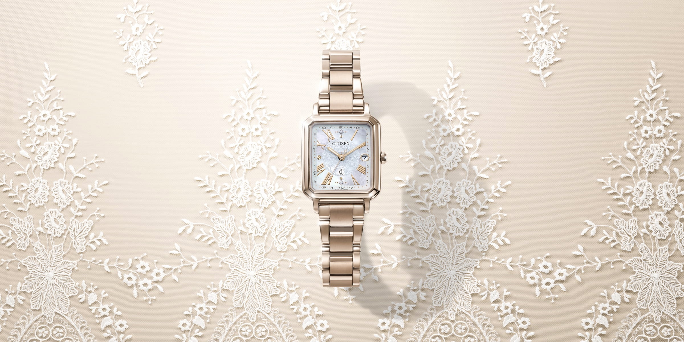 文字板にはほんのりとベージュカラーを重ね、中央には繊細なアンティークレースをモチーフにしたパターンをエッチングで描いています。12時と6時位置にはラボグロウン・ダイヤモンドをセッティング。ネックレスのような装飾が、さりげないアクセントとして輝きを添えます。ダークグレーのサテン調バンドをセットした2Way仕様で、気分やシーンに合わせて簡単にバンド交換ができるインターチェンジャブル構造を採用しています。