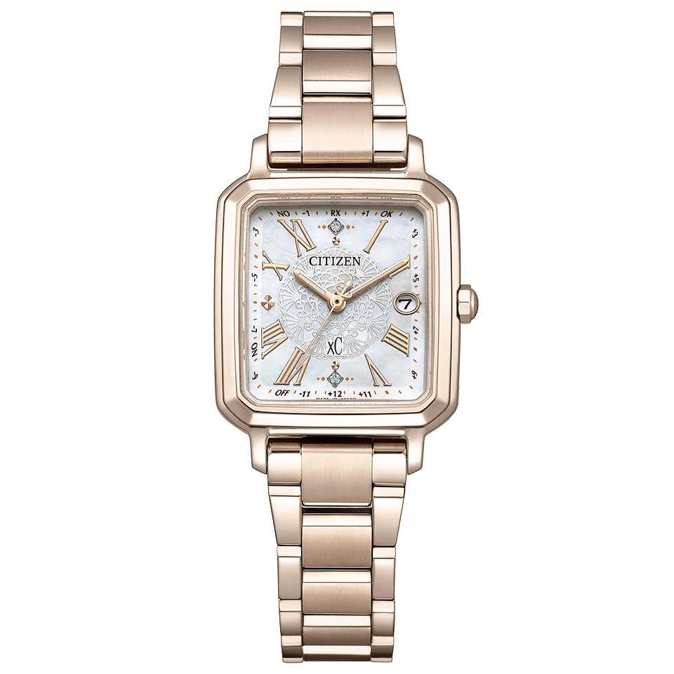 やさしくフェミニンな印象を与える、サクラピンク®のスクエアケースに、クラシカルで華やかな白蝶貝文字板を組み合わせたモデル。