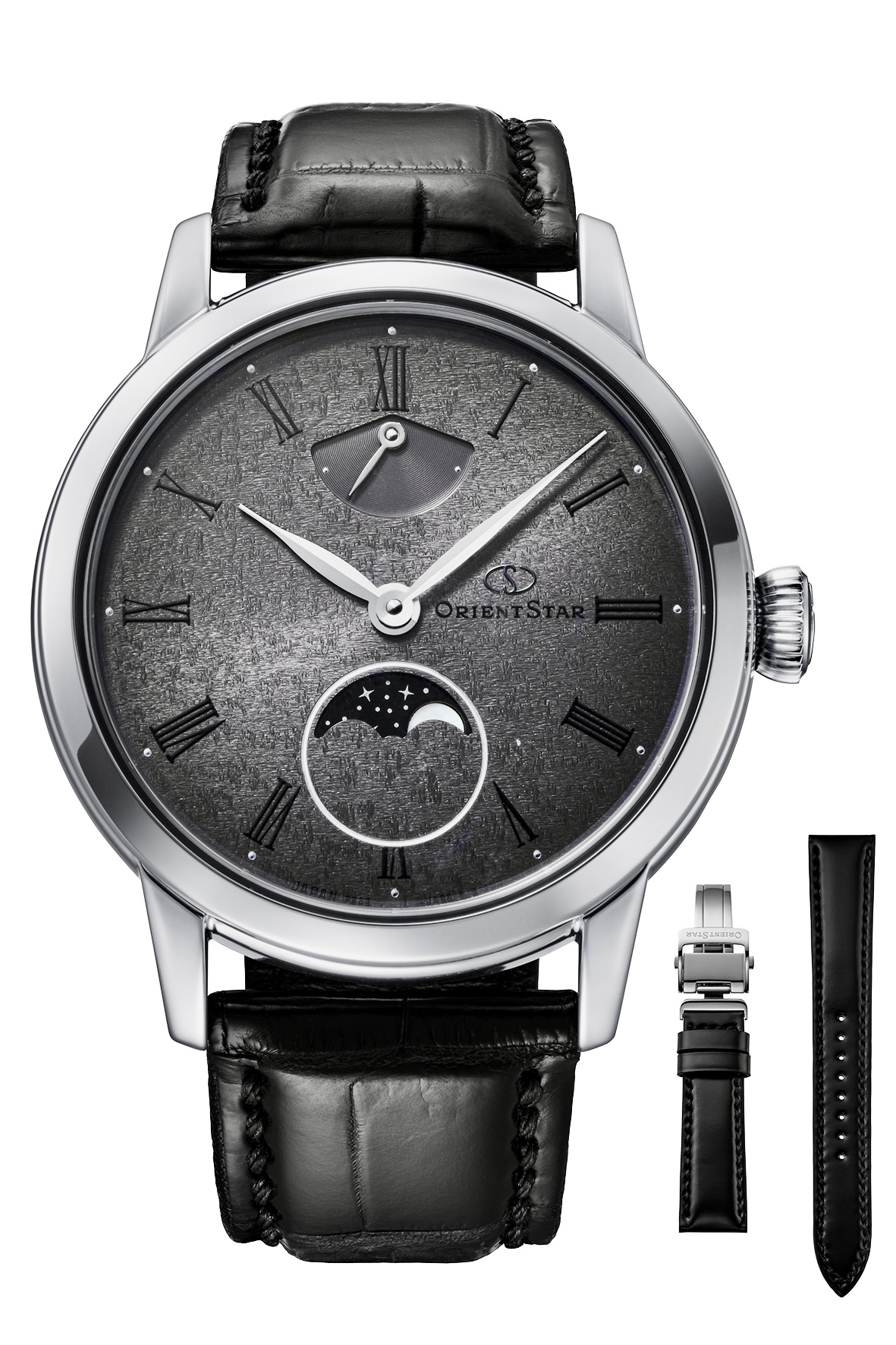 「悠然とした時の姿」をテーマとし、要素を削ぎ落した新たなデザインを追求。時刻表示においては時針と分針のみ、その他の機能はオリエントスターのアイコンであるパワーリザーブ表示と月齢表示というシンプルな構成です。