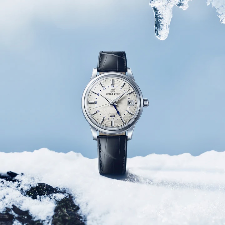 早春の季語「雪雫」から着想を得て、春の陽射しに輝く雪どけの雫をダイヤルに表現したクラシックスタイルのGMT機能付きモデルです。モダンな幾何学螺旋模様は、光の角度によって表情を変え、奥行きと動きを感じさせます。精緻なパターンが、ダイヤルに上質な立体感を与えます。搭載するムーブメントはメカニカル「キャリバー9S66」。最大巻上時約72時間(約3日間)の持続時間を確保しており、第二時刻を同時に指し示すGMT機能を備えています。ブルースチールの24時針が織りなす上品なクラシックスタイルに、モダンなダイヤルデザインが調和し、グランドセイコーならではの優雅さを演出します。