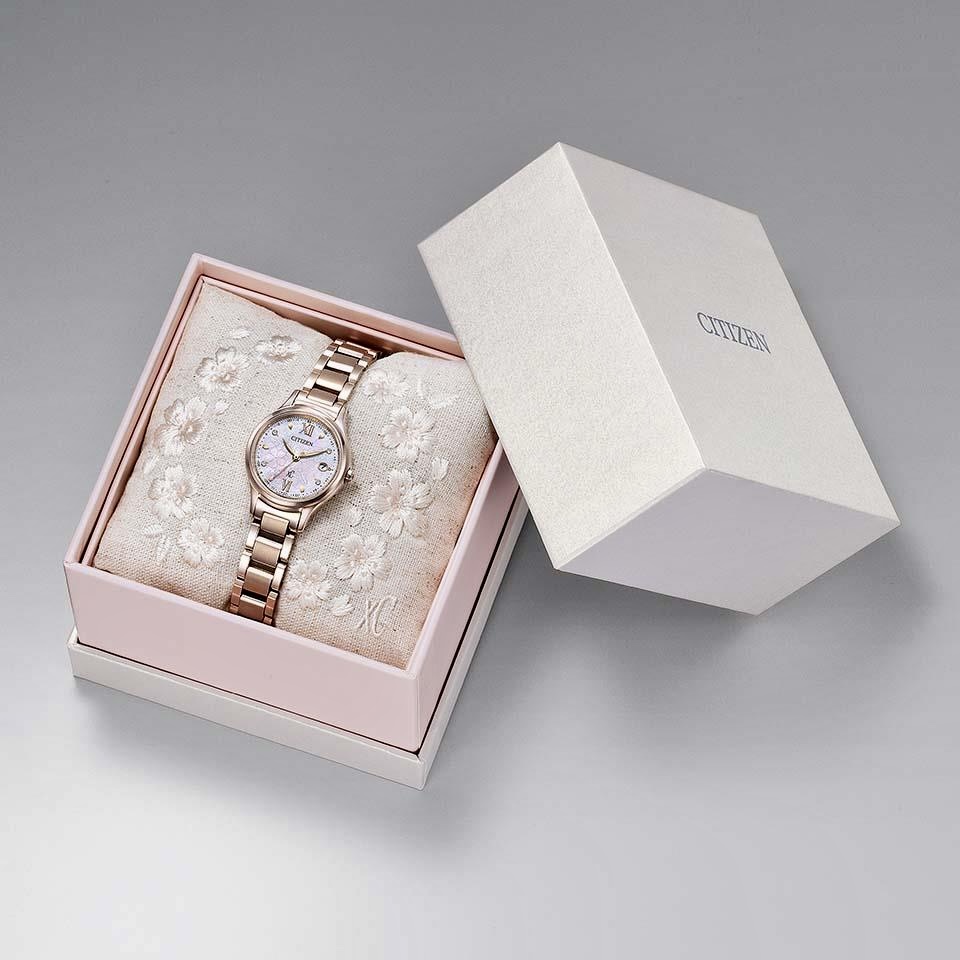 裏蓋には、xCロゴと30周年を記念したモチーフが刻印されています。ピンクとホワイトの特別なボックスと、可憐な桜の刺繍が施されたクッションにより、時計を優しく包み込むように収納できます。