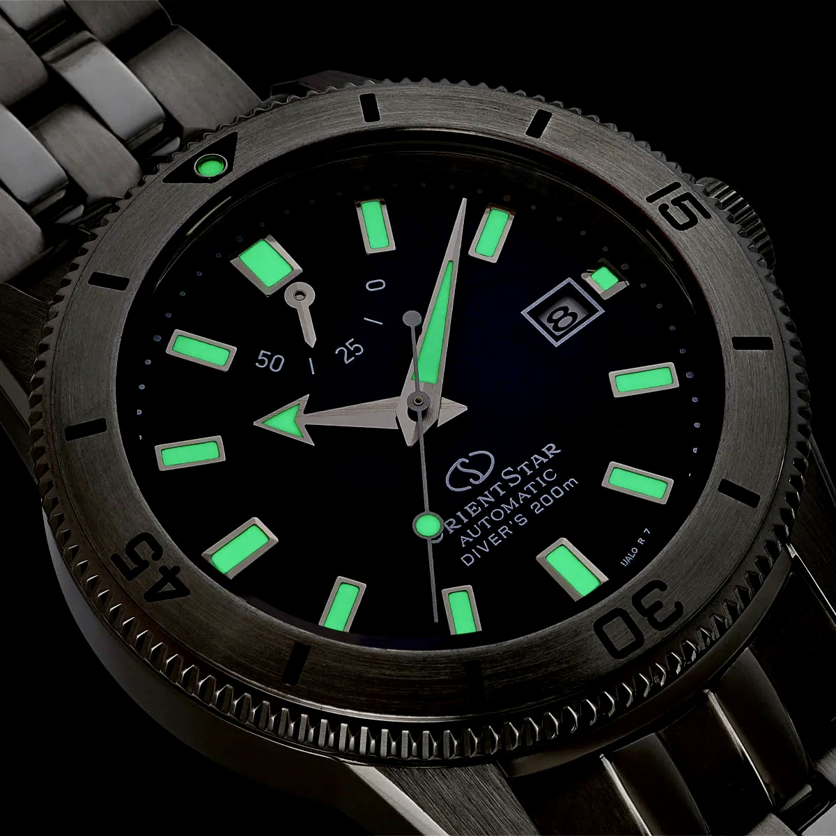 ドレッシーな5列駒のメタルバンドは腕なじみが良く、さらにエクステンション構造やプッシュダブルロック三つ折式バックルが付属して、マリンスポーツからタウンユースまで幅広く使えます。