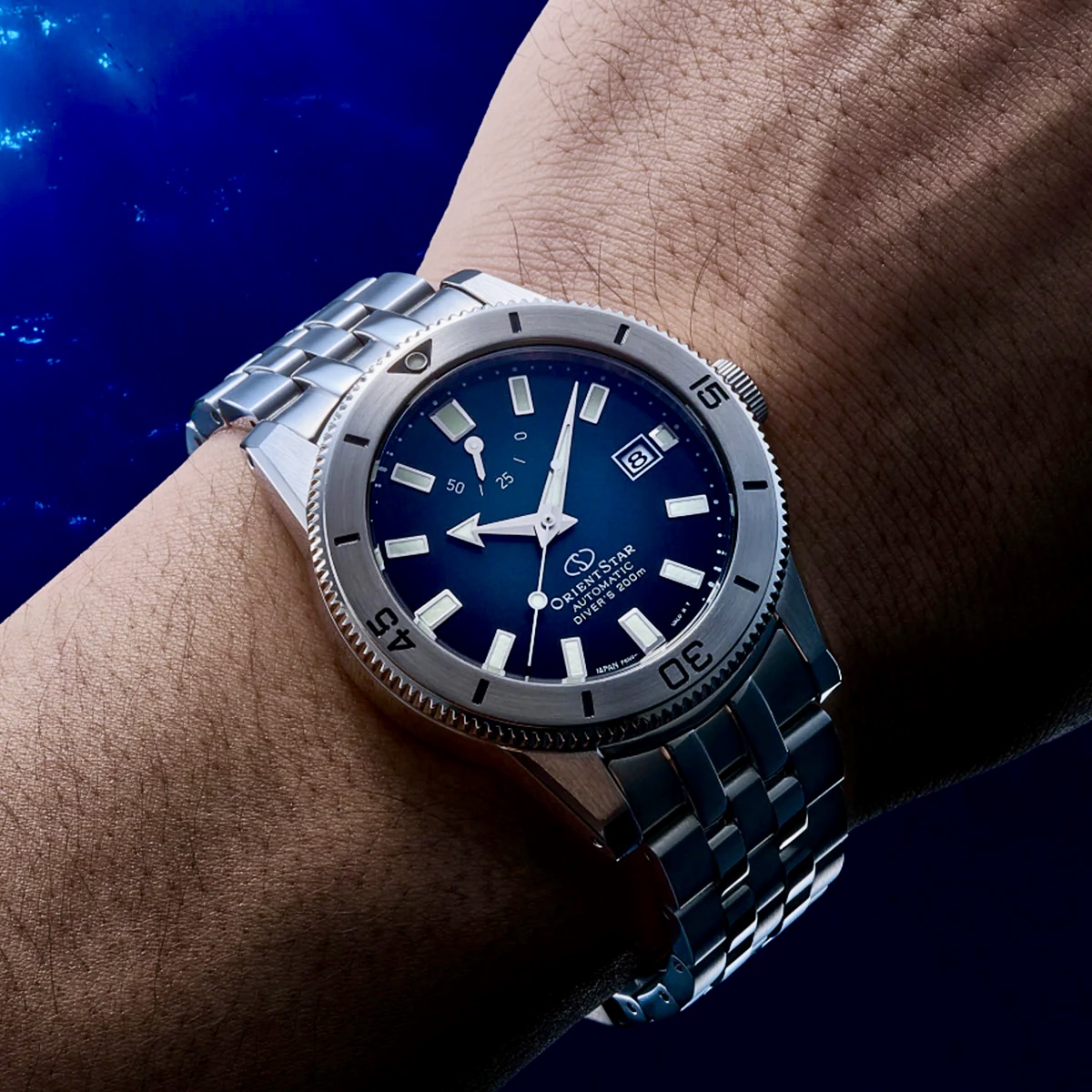 夜空に輝く星の輝きを受けて変化する海面の表情を表現した文字板は、中心のブルーグレーから外周に向けてブラックへと変化するグラデーション加工が施され、濃淡の変化はまた、海面から深海へと続く世界をも連想させます。