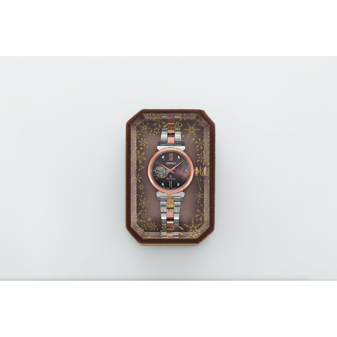 静かな冬の森が織りなす美しい景色を表現した、煌めきを纏うモデルが登場。大人でシックな配色と美しい輝きが魅力的な、ホリデーシーズンだけの限定モデルです。あたたかい光の中で、葉を落とした樹木の幹がくっきりと浮かび上がる様を、ブラウンのダイヤルカラーと木立をイメージしたランダムな縦ストライプで表現。光の煌めきは白とオレンジのクリスタルガラス、白蝶貝の煌めきで表現しました。