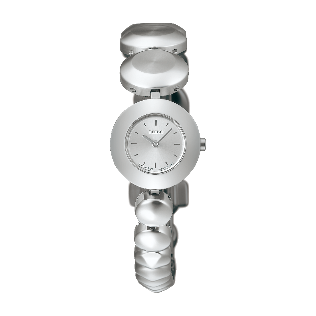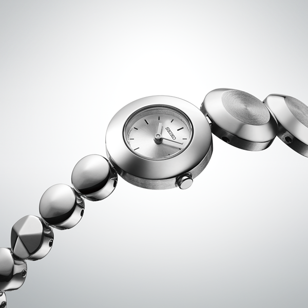 性別、固定概念を超え、身に着けたひとの心に高揚感をもたらす、ピュアな魅力を持ったブレスレットウォッチです。ゆったりと着用するスタイルの腕時計で、どなたの手元にもなじみます。時計本体を境に12時側と6時側でサイズの異なるコマを使い分けた、見る角度によって印象が異なるアンシンメタリーなデザインが特徴です。