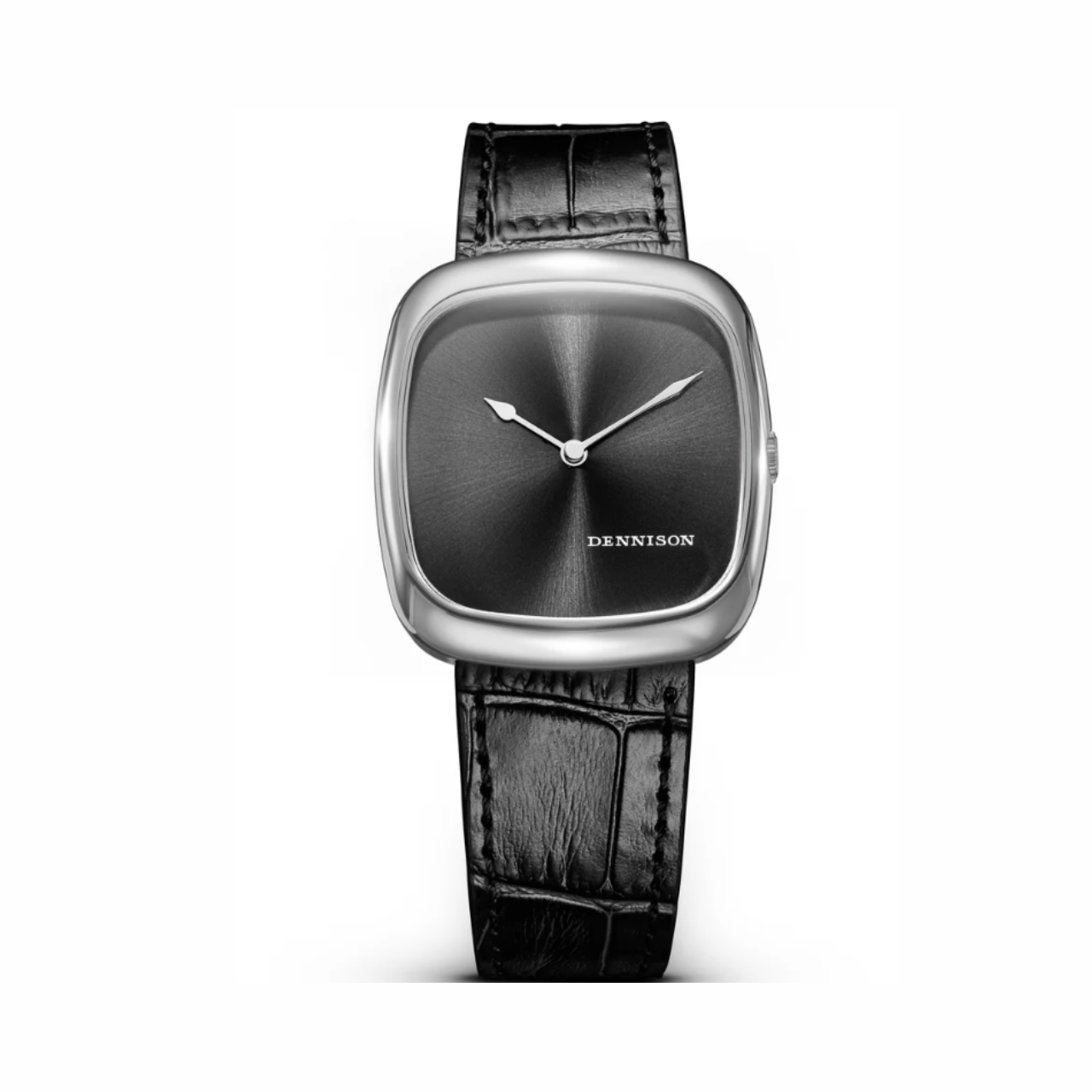 クラシックなデニソンクッションケースを現代的に復刻したALDコレクションは、1960年代の洗練された美学とセンスを体現しています。文字盤にはブラックのサンレイ仕上げが施され、光を受けて繊細な放射状のブラッシングが浮かび上がります。ヴィンテージ感と現代的なスタイルが融合し、時代を超越した存在感を放ちます。ステンレススチール製のケースは、縦37mm、横33.5mm、厚さ6mmです。ケースのエレガントな曲線と仕上げを映し出す、特注のピンバックルを備えたブラックのエンボスレザーストラップが付属します。